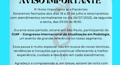 Estaremos fechados dos dias 18 a 25 de julho e retornaremos com atendimentos normalmente no dia 28/07/2025, de segun…